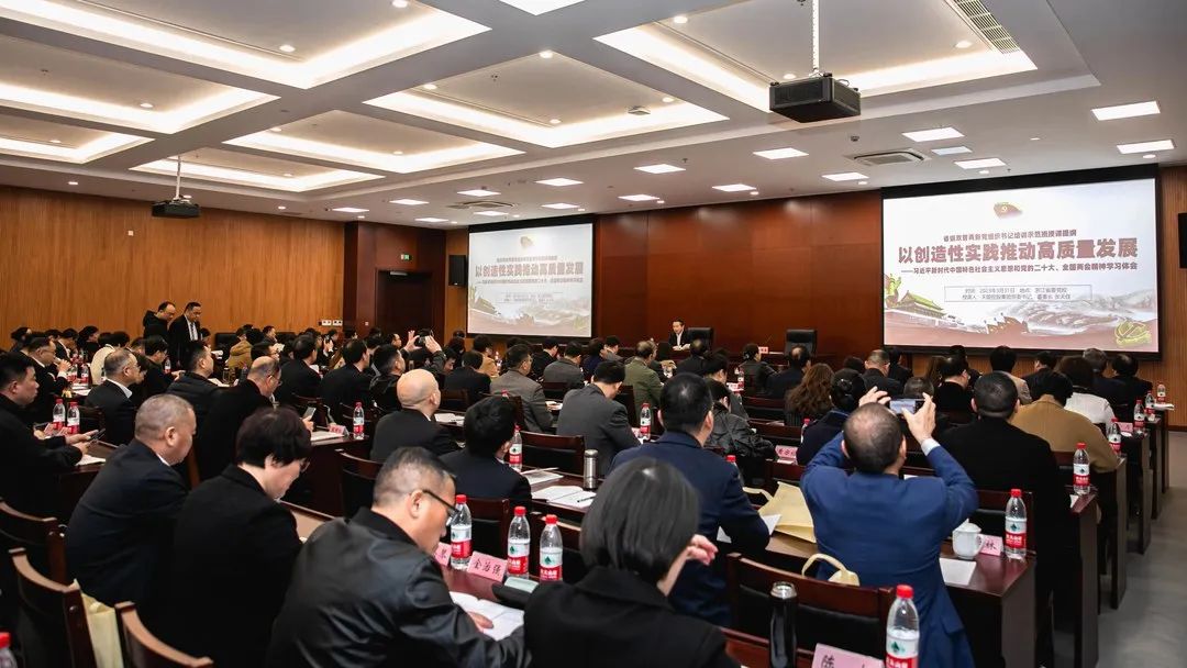 张天任董事长授课主题是《以创造性实践推动高质量发展》。他表示,习近平新时代中国特色社会主义思想、党的二十大、全国两会都贯穿着“高质量发展”这条主线。他结合浙江高质量发展的实践,JJB竞技宝高质量发展的历程,从十二个方面对“以创造性实践推动高质量发展”进行全面解读。
